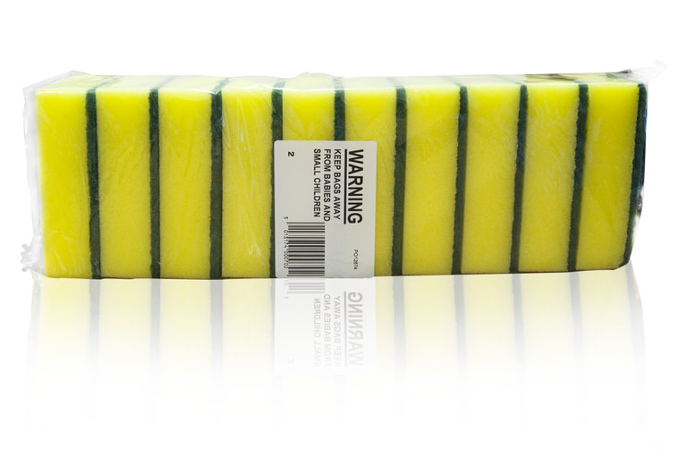 Green Heavy Duty Sponge Scourers with finger grip nail saver design, sold as pack of 10 sponge scourers and available in a range of colours to suit colour coding. These green colour coded heavy duty sponge scourers are great for general purpose cleaning and washing up. The tough & abrasive scouring pad is long-lasting whilst the grooved finger-grip design protects your hands and makes for easier cleaning.